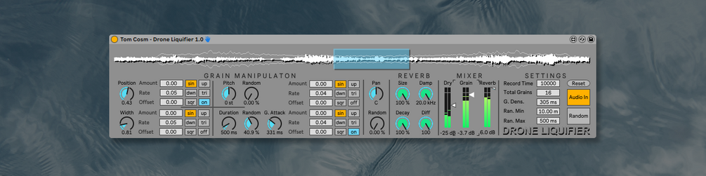 Drone Liquifier melts anything you feed it into a big pool of atmospheric soup. It combines a granular sampler and an extra long reverb to convert your audio into an epic drone soundscape.